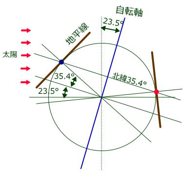 図2は東京都の位置する北緯35.4度の地点が 図1の遠日点Aで太陽から昼間に光を受けている様子です。 |